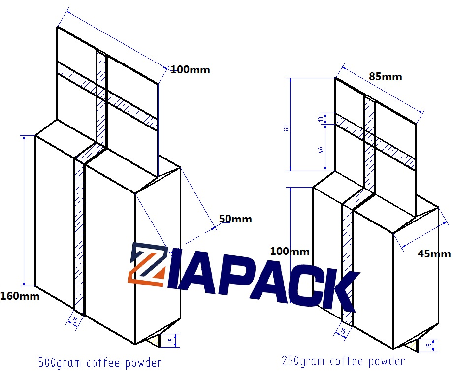 本機包括ZL520立式製袋包裝封口機1台、ZL2000螺旋計量機1台、ZL100V2雙真空室包裝機1台、輸出輸送機1台,具有製袋、產品充填、清袋功能。和抽真空。可以選擇更流行的熱轉印打碼機在咖啡磚真空袋上製作日期編碼。該機器廣泛用於包裝食品藥品化學品和其他粉末或小顆粒產品。如咖啡粉、酵母粉、小麥粉等。整機採用內抽抽真空的方式抽真空。真空度高,包裝速度快,可達8袋/分鐘。成品非常漂亮,有保質期長。