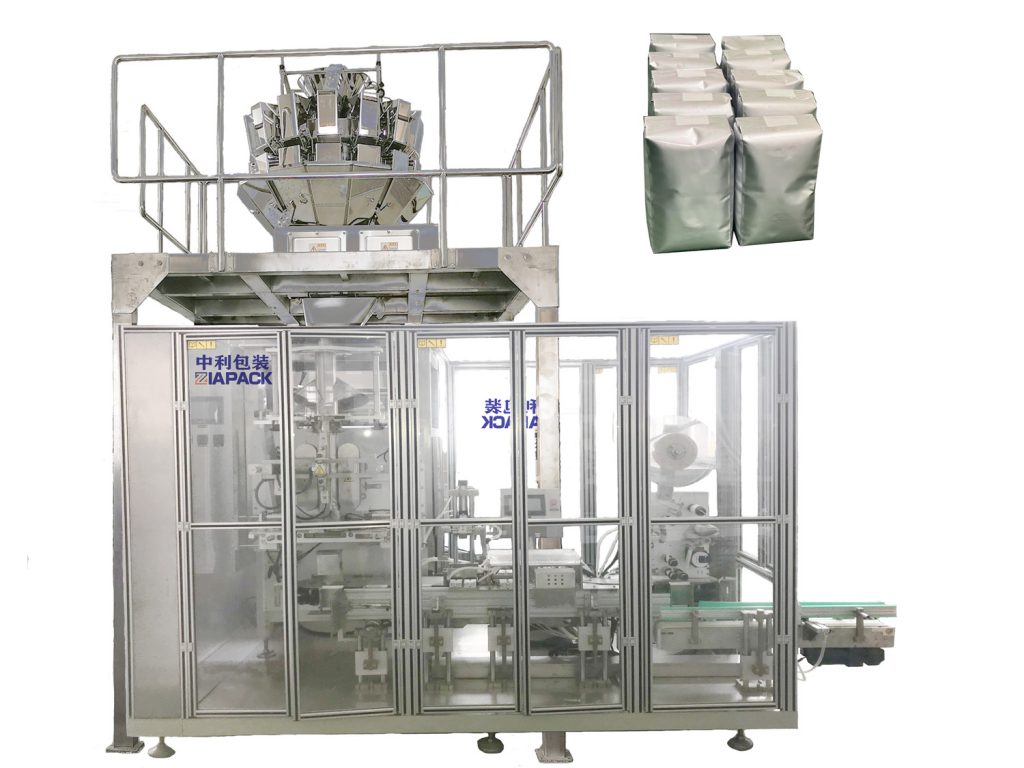 整條線包括一台vffs製袋灌裝封口機一台頂貼袋包裝機一台重量檢查緩衝輸送機一台收縮膜包裝機整機可自動完成穀物稱重製袋封口貼和整經。有一個額外的可選功能袋真空可以添加到該單元機器上。