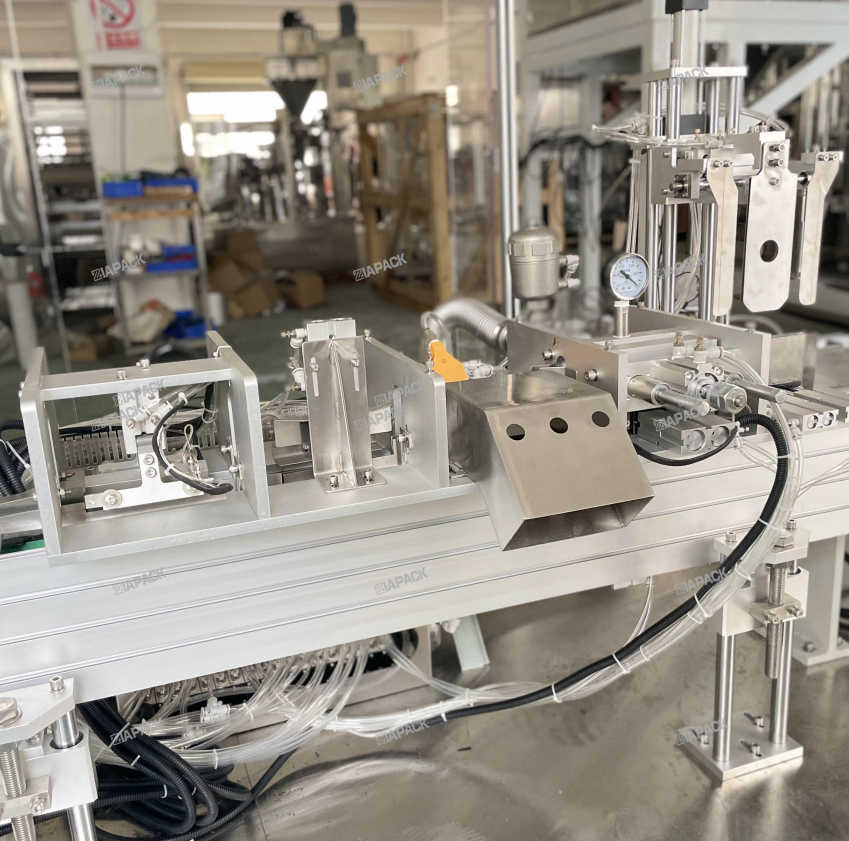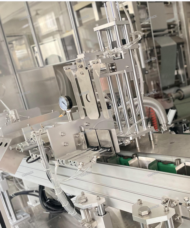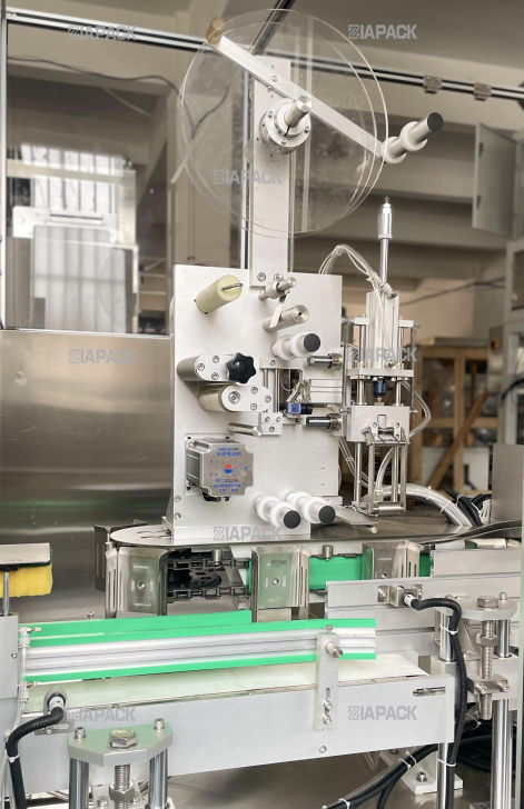 本機專為製作頂部貼標的插角袋而設計。裝滿產品的袋子落在本機上後,本機將提袋,經過一次袋口折疊,然後貼標。機器框架由SUS304 .PLC及觸摸屏採用西門子品牌,氣動元件採用SMC品牌,主要電器元件採用歐姆龍和施耐德品牌。本機與自動包裝機配合使用,達到成品袋頂貼標。本機可自動達到功能標籤分離,標籤發送。標籤檢測器和標籤壓合。