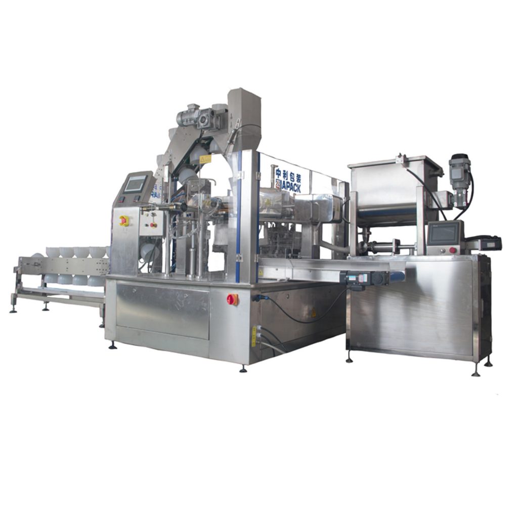 本機設計用於灌裝液體產品與固體產品混合,如醬菜湯、酸橄欖、酸黃瓜等預煮食品。帶有碗式升降機,用於將固體產品送入預製袋,然後活塞泵灌裝醬 。