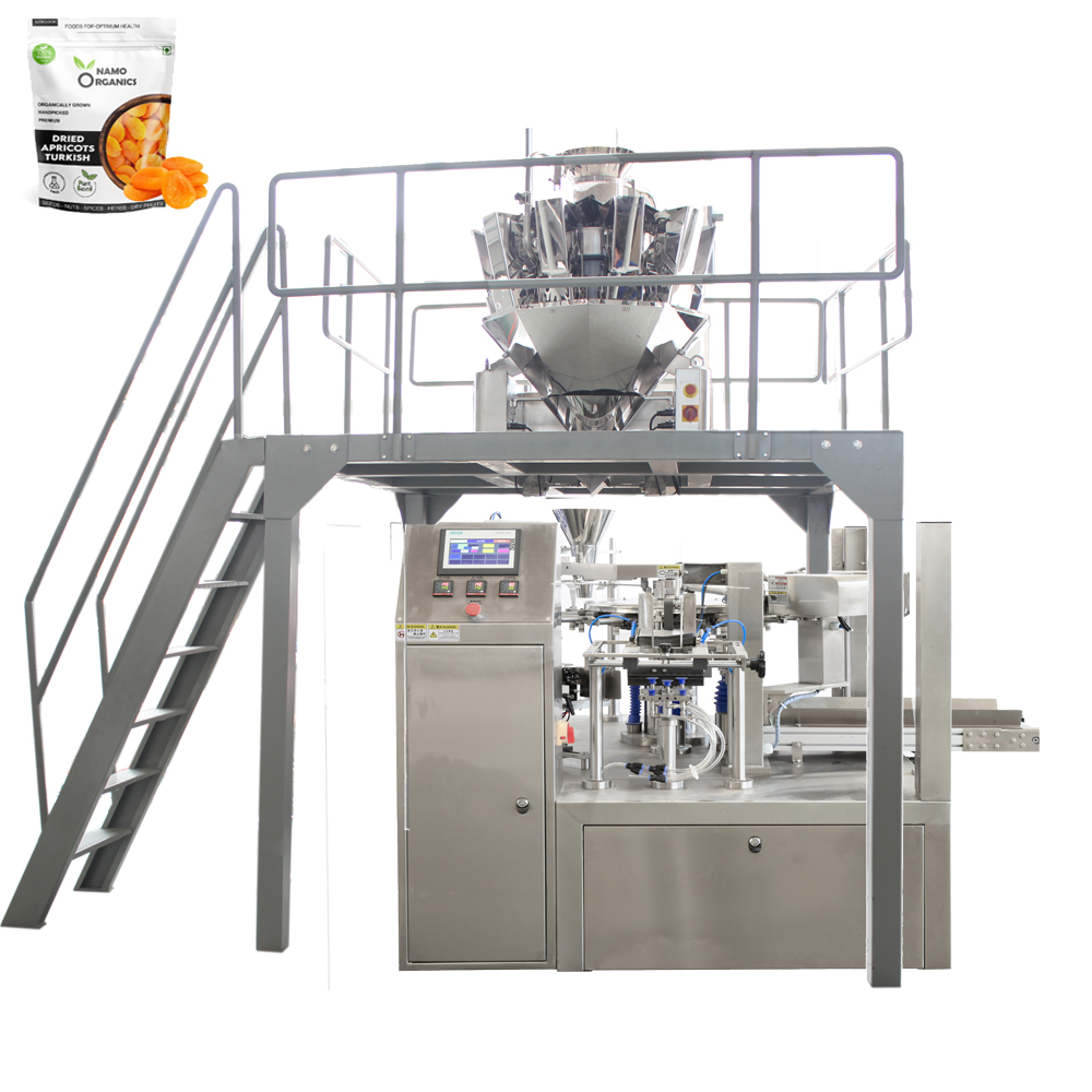 旋轉袋式包裝機 不同劑量(如多頭秤,螺旋填料,液體填料等)可適用於顆粒,粉末,液體,糊狀物等的自動包裝。不同種類的產品配有預製立式拉鍊袋等。