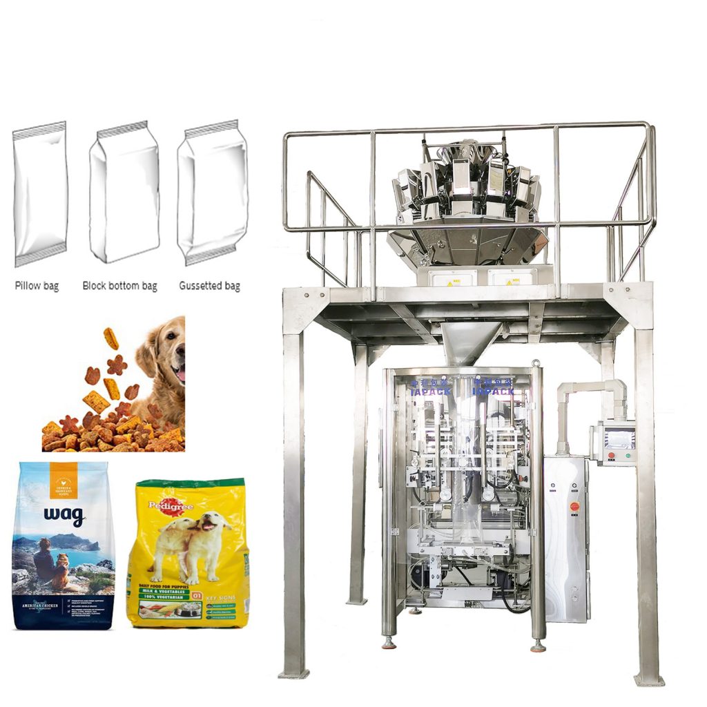 本機組由一台VFFS520全自動立式包裝機、一台ZR14-1.6L多頭稱重機、一台DT5斗式提昇機組成。可自動實現上料、稱重、製袋、充填、包裝、打印、分切等功能。
