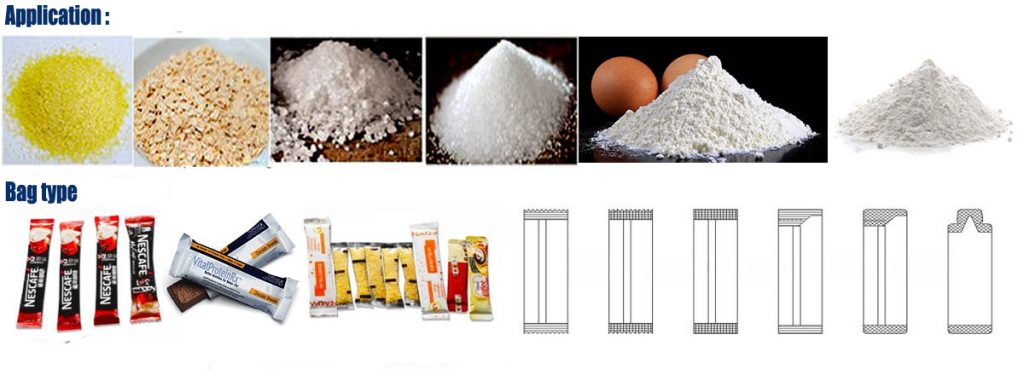 本機主要用於包裝粉末產品:如奶粉,奶茶粉,咖啡粉,香料,咖哩粉,蛋白粉,調味品,草藥粉,化學和醫用粉末產品。