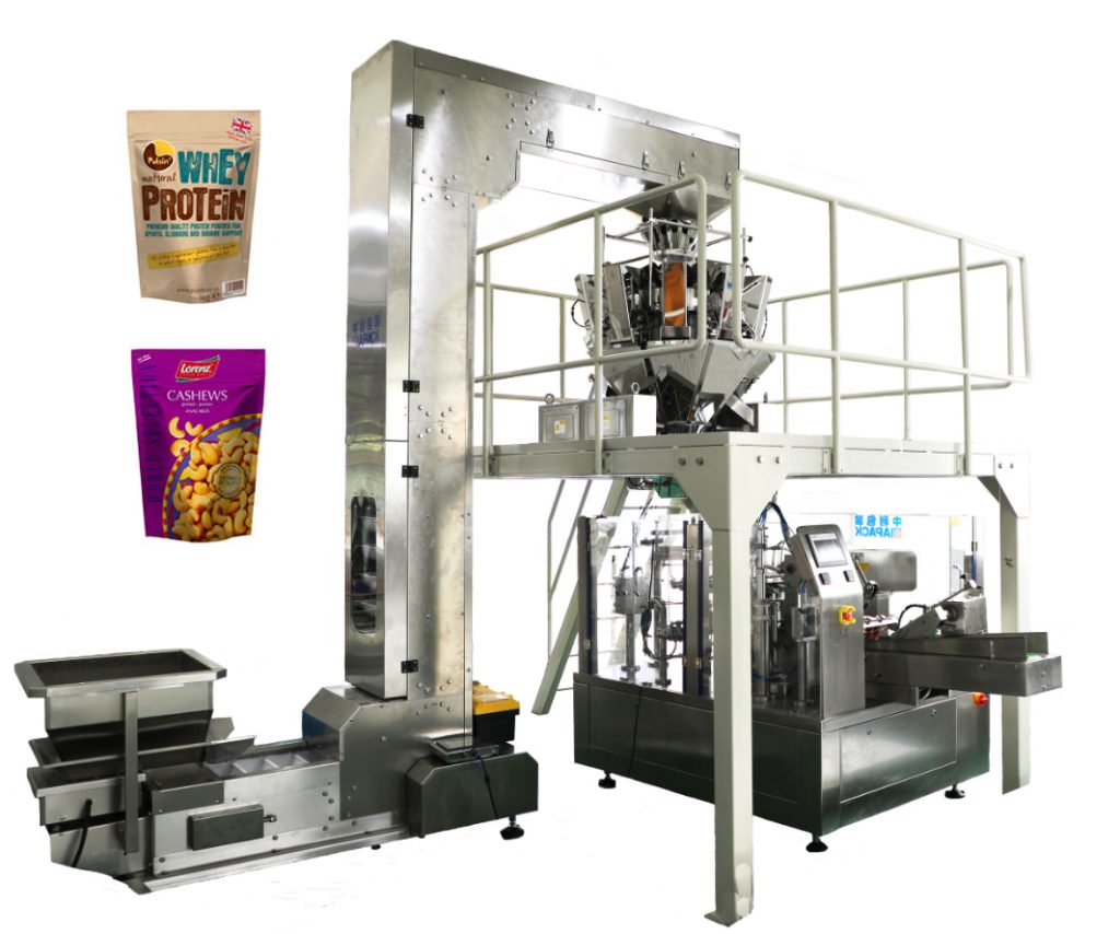 旋轉袋式包裝機 不同劑量(如多頭秤,螺旋填料,液體填料等)可適用於顆粒,粉末,液體,糊狀物等的自動包裝。不同種類的產品配有預製立式拉鍊袋等。