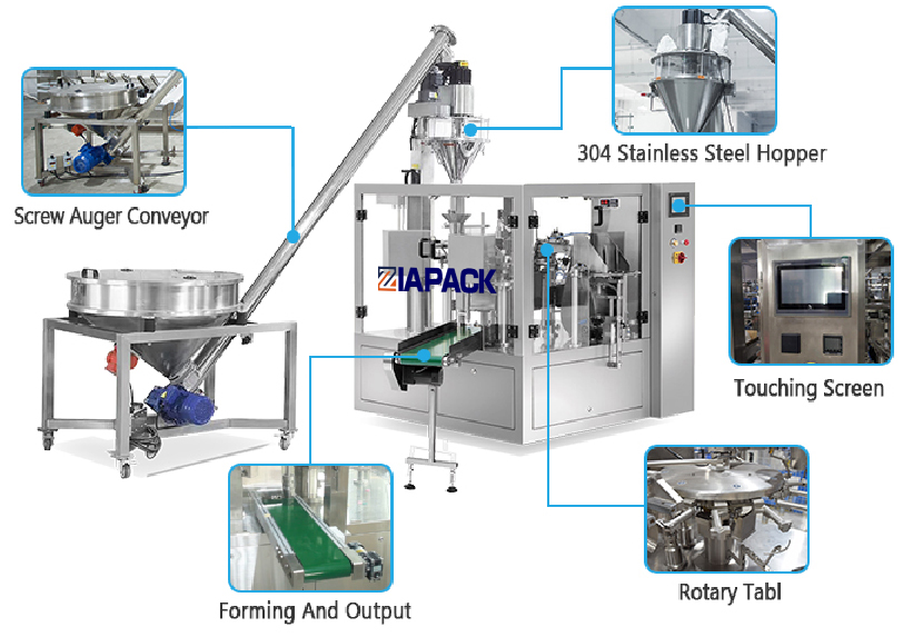 配備Augur填料和螺旋升降機,廣泛應用於洗衣粉,奶粉,麵粉,香料,椰子粉,咖啡粉等包裝粉末。